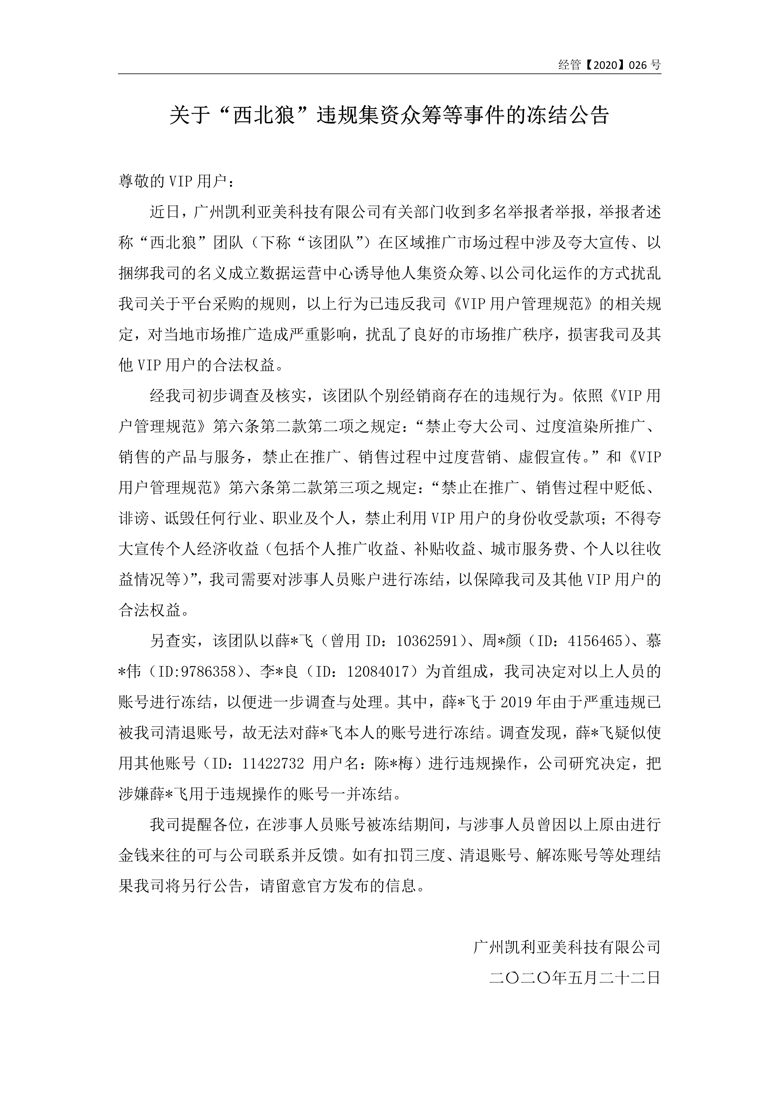 关于“西北狼”违规集资众筹等事件的冻结公告