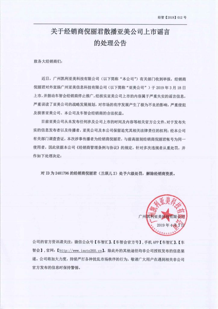 关于经销商倪丽君散播亚美公司上市谣言的处理公告