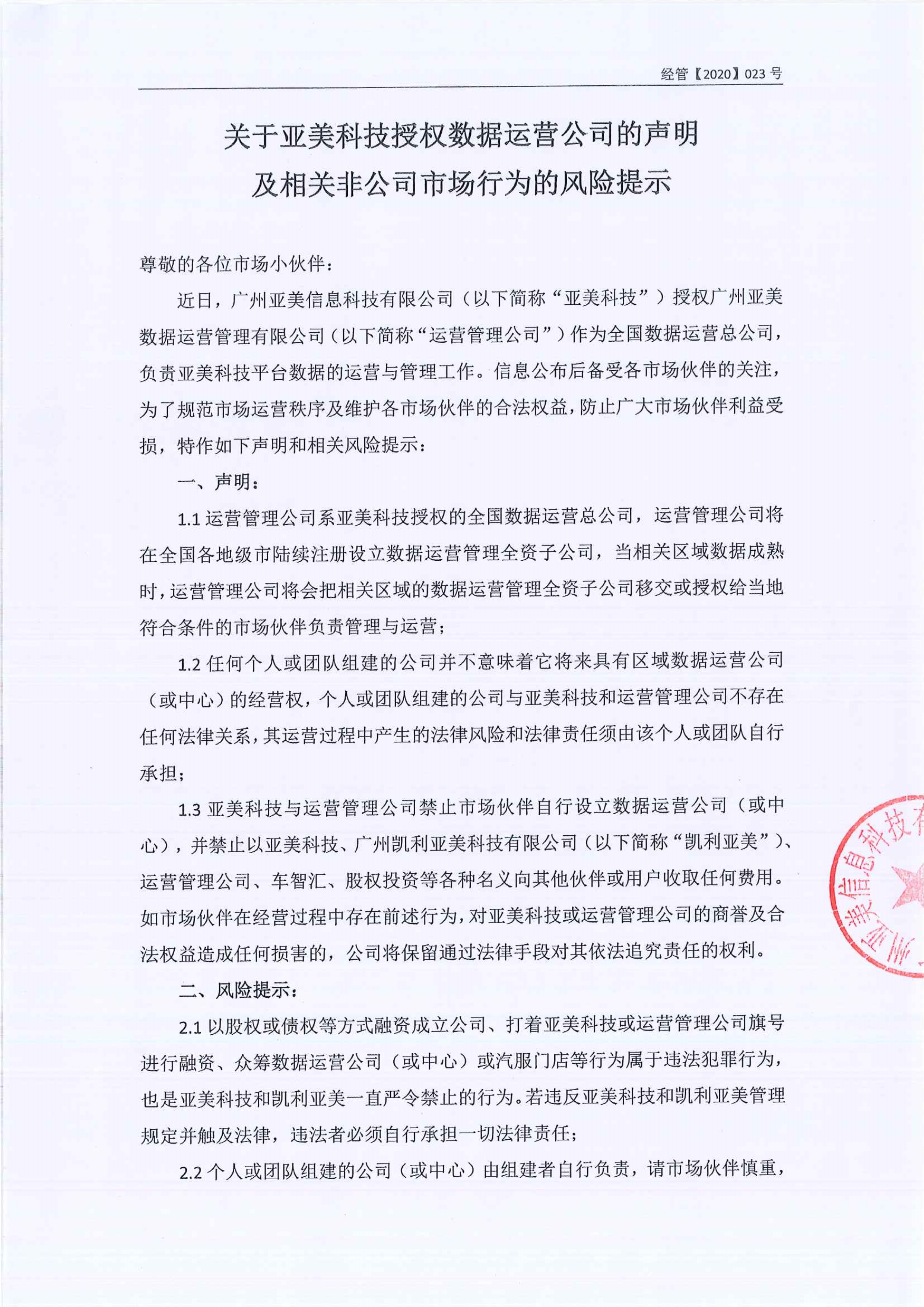关于亚美科技授权数据运营公司的声明及相关非公司市场行为的风险提示